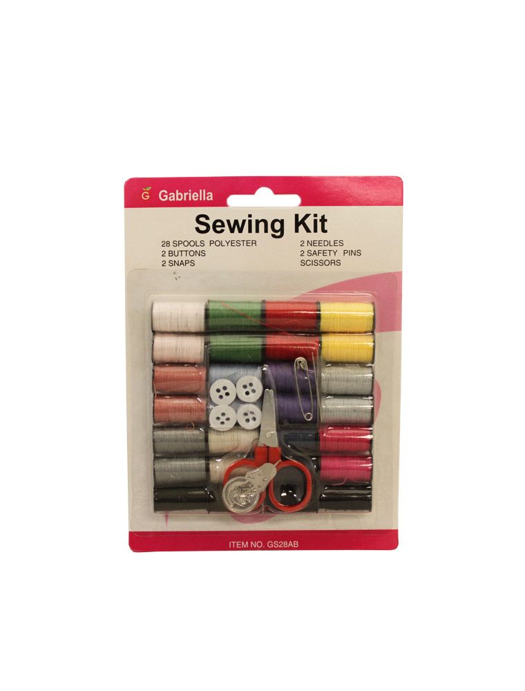28 Spools Polyester , 2 Needles, 2 Buttons, 2 Snaps, 2 Safety Pins, Scissors